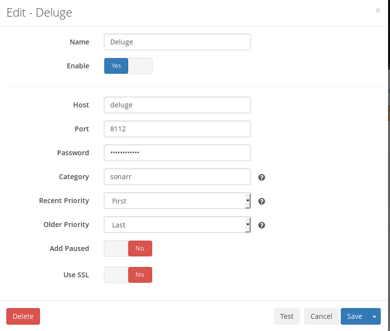 To add Deluge as a download client in Sonarr/Radarr use the following settings. Both are able to remove completed torrents after they have finished seeding.